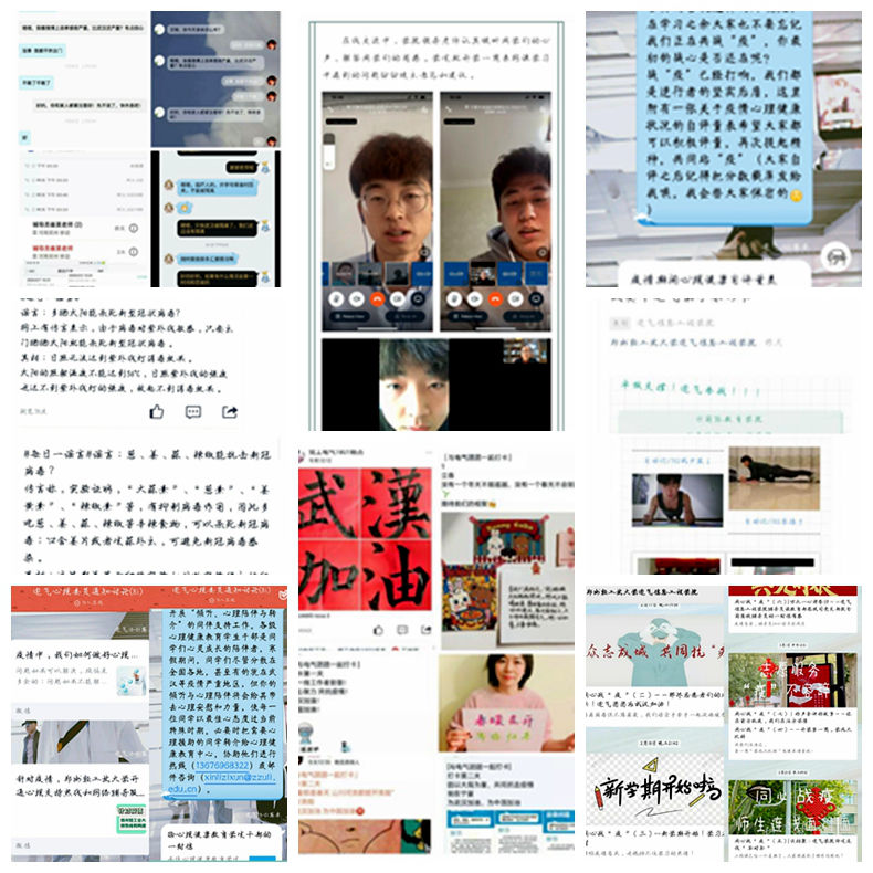 疫情期间,LOL比分 通过多种形式引导学生做好心理自助工作,及时了解学生心理状况,进行心理排解工作。首先LOL比分 全面深入的排查学生的心理状况,通过宿舍长—班级心理委员—带班辅导员—心理健康教育专职辅导员四级网络体系及时开展心理调查。通过填写心理测评、心理访谈等多种形式了解学生心理状况;其次召开了心理健康工作会议部署了疫情期间的心理工作。各级心理健康教育干部要负其相关责任,积极开展线上心理辅导工作,各班心理委员每周通过视频方式开展心理主题班会。心理专职辅导员及带班辅导员及时与同学们进行线上心理访谈,正面引导学生情绪。其次LOL比分 开展了线上的防疫主题活动,通过“手写祝福”、“每日打卡”、“平板撑挑战”、公众号定期发布防疫有关的推文等方式向同学们传递美好的祝愿,带给同学们温暖。