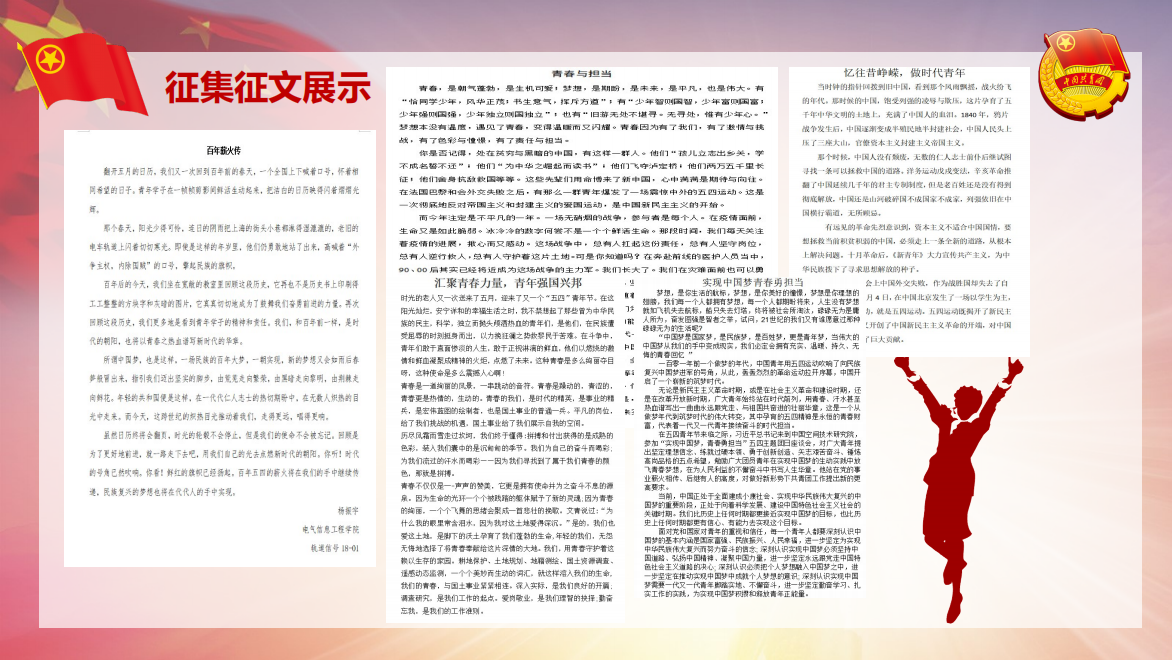 征文活动紧扣五四精神,以歌颂党的丰功伟绩为中心思想,以爱党,爱国、敬业、乐业、传承五四精神为主要内容,主题鲜明,立意新颖,内容积极向上,思想性教育性强,充分展现当代大学生的良好精神风貌。同学们积极投稿,用自己的笔记录了我们国家从1919年5月4日到如今的沧桑巨变,以个人独特的视角阐述了个人对青年奋斗,五四传承的理解。同时也呼吁广大同学清楚认识只有把个人前途同祖国命运、人民事业融为一体,才能让青春焕发出最耀眼的光芒,才能真正实现人生价值。