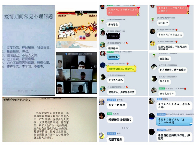 各班针对疫情期间下同学们常见的一些心理问题,如神经敏感、幽闭、学习惰性等进行讨论,通过文字和语音发言的形式提出解决方法。同时,通过抗疫小漫画,治愈系电影等调节同学们心理情绪,激励同学们积极面对生活,安心居家学习。