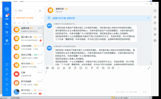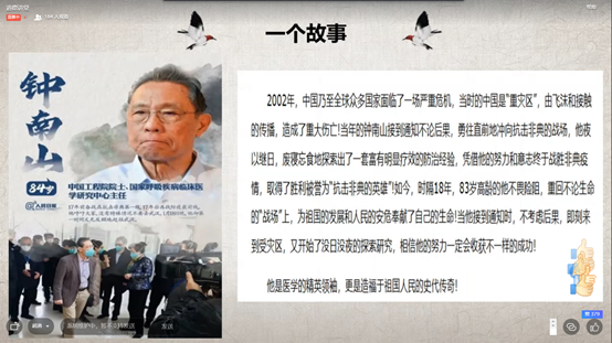 活动开始,主持人向参加活动的同学们点明的此次活动的主要目的,并对接下来的活动流程进行了简要的说明。本次活动设计了六个特色小活动:“分享一个故事”、“朗诵一段经典”、“看一段道德短片”、“知识竞赛”以及“谈一番感悟”、“听一首歌”。活动中主持人分享了钟南山院士无私无畏为人民服务的英雄事迹,以此让同学们感受钟南山院士身上优秀的精神品质,学习他为国为民的精神。曹雷同学声情并茂的朗诵让大家体会到了懂得感恩的温暖,以及榜样的伟大。随后大家一同观看了华为CEO任正非的童年故事,一同回顾了华为崛起的纪录片,对此每一个人都感悟颇深。紧接着,到了“知识竞答”环节,同学们踊跃连麦回答问题将直播气氛推向高潮。随后,是由同学代表就本次活动谈自己的感悟,每一位同学都表达出了自己在此次活动中的成长。最终在《南山不老松》温暖而悠扬的曲调之中,活动也渐渐落下帷幕。
