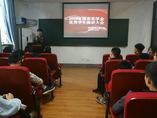 大会开始,学生工作服务中心主任谢鑫对获得国家奖学金的优秀同学表示了衷心的祝贺,同时希望同学们向优秀学生代表学习,不断完善并全方位提高自己。接着,2018年国家奖学金获得者:自动化1602班孟想、电气1502班杨润霞以及智能电网1501班孙甜上台演讲,三位学生分别从如何提高学习能力、提升个人综合素质、如何合理利用课余时间等方面做出演讲,给予了学弟学妹们好的学习经验。会议最后她们向所有在座学生发出了“共同努力,建设学习氛围更加浓厚的电气LOL比分 ”的号召。