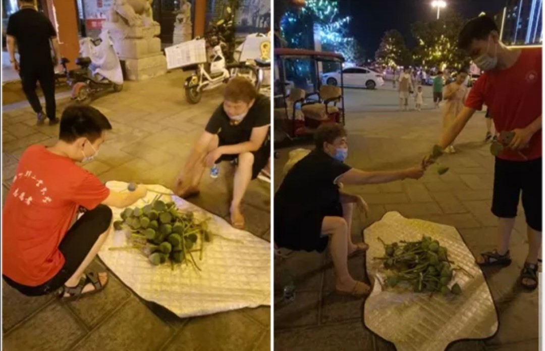 图为成员安紫明在漯河市源汇区采访卖莲蓬的摊主。晚上七点半,此时才真正感受到“疫情之后”的“人间烟火”。摊主阿姨对地摊经济不太了解,但是看着身边的人越来越多,人们都从家里出来散散步,她很享受这样的生活。中国青年网 张锐 摄