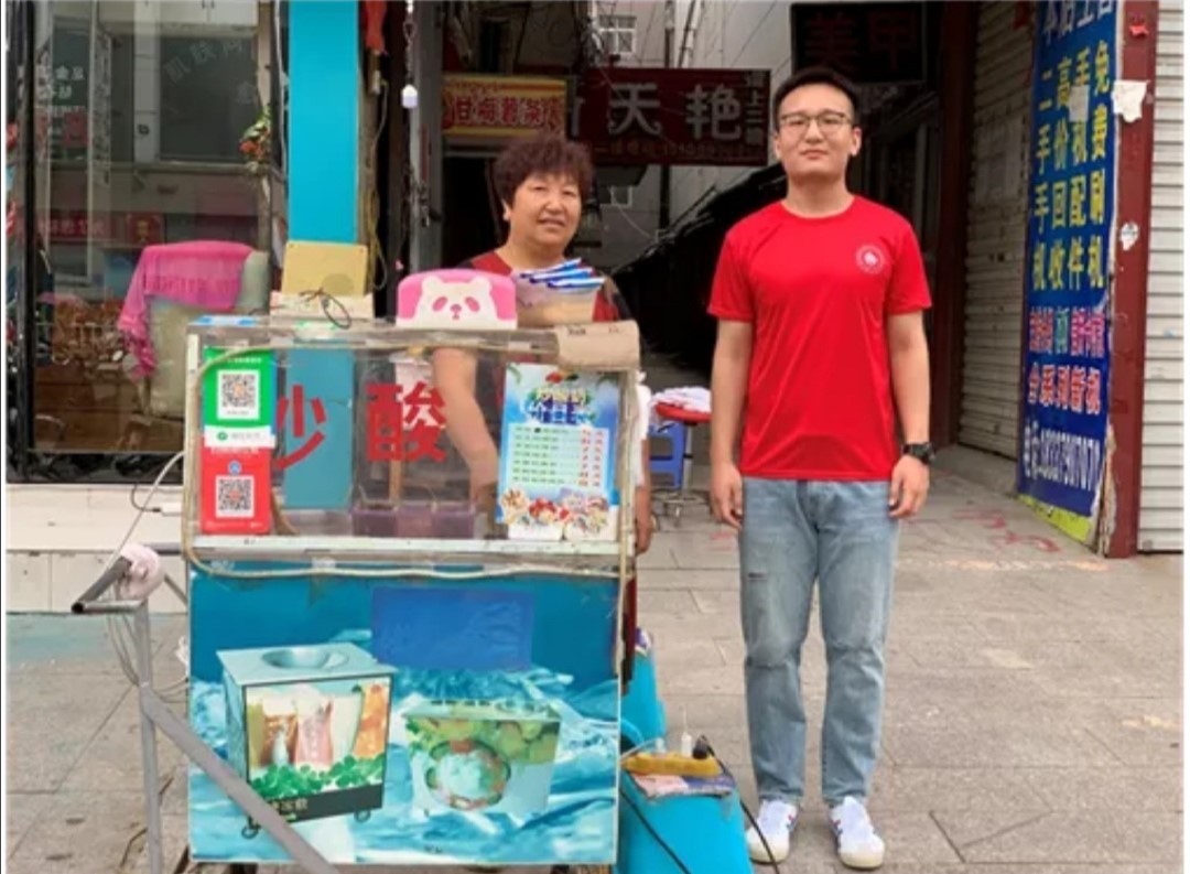 图为分队成员们在郑州市中原区采访摊主王阿姨。最后,成员们在离开之际还帮助王阿姨打扫附近的卫生。中国青年网通讯员 余航 摄