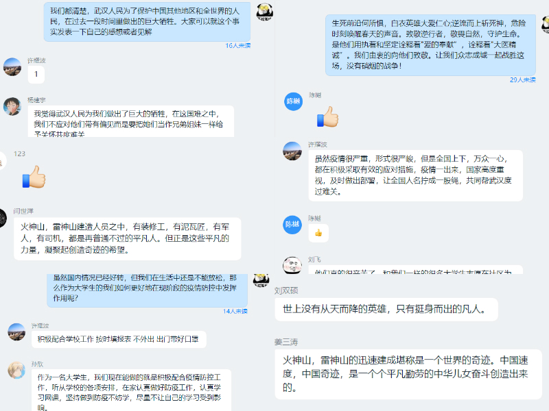 活动举办期间,同学们个个热血沸腾,看着祖国在抗疫道路上付出的点点滴滴,白衣天使们的日夜奋战,抗疫英雄们的不畏生死,每一幕都给同学们留下深刻的印象,同学们纷纷发表自己的感想,写下活动感悟,充分领悟中国特色社会主义制度在抗疫过程中的优越性,充分认识到党在抗疫过程中的重要性。