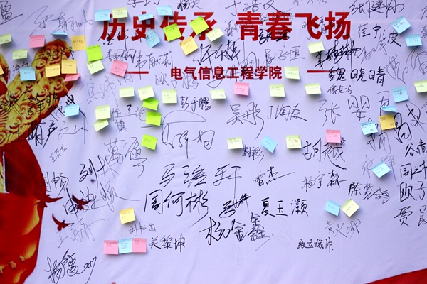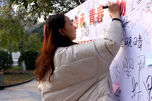 活动设置知识竞答环节,同学们通过回答有关一二九、党团、“四史”的问题进行积分,并可将积分兑换成相应的奖品,不仅使同学们获取了知识,而且提高了同学们对活动的积极性与参与度。在活动接近尾声时,工作人员向同学们分发便签,同学们在便签上写下对一二·九的感悟与理解、对祖国的展望与祝福等等的话语,表达内心对祖国的热爱与祝福以及对青年责任的理解和担当。同学们将写好的便签贴在彩色展板处,并在展板上签下自己的名字,以表示内心的坚定与期盼。