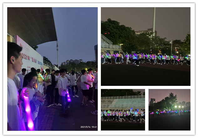 随着夜幕降临,工作人员开始在运动场布置现场,同学们兴致勃勃到操场主席台下领取了荧光棒。晚上七点活动正式开始,150名参与者拿起荧光棒、带上荧光手环,整理好队伍,迈着有力的步伐一起出发。同学们在斑驳闪耀的星光中奔跑,把整个运动场装点成了一道道亮丽的风景线。大家纷纷表示在奔跑中感受到了运动的快乐,享受着远离网络、远离喧嚣的时光,摆脱疲惫,释放压力。运动场上荧光闪闪,每一个夜跑的人都是夜空中最亮的星,用青春点亮轻大的夜空,成为最亮丽的风景。