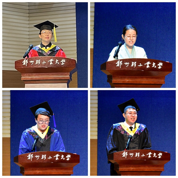 河南省优秀毕业生冯凯代表硕士毕业生发言。他深情回顾了三年研究生科研学习时光,表达了对母校的感恩感谢,激励同学们要相信自己,坚定信念,脚踏实地,勇攀更高的山峰。