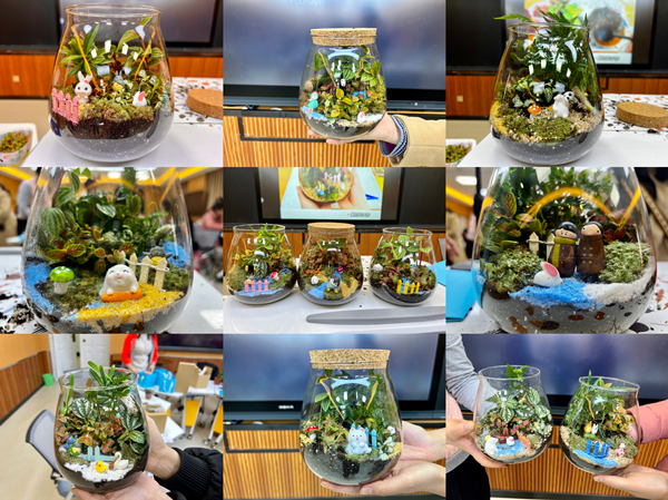 放上营养土、狼尾蕨、罗汉松、网纹草、红点草、摆件,随后小心翼翼地覆盖上苔藓,喷洒一点清水。在连绵不断的欢声笑语中,历时一个小时,在老师们指尖灵巧的摆弄下,诸多精致的微景观生态瓶就做好了。