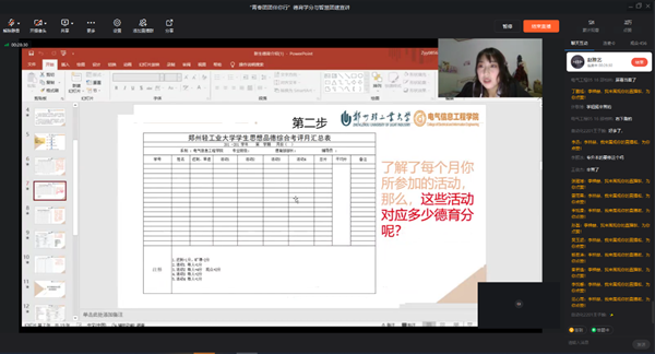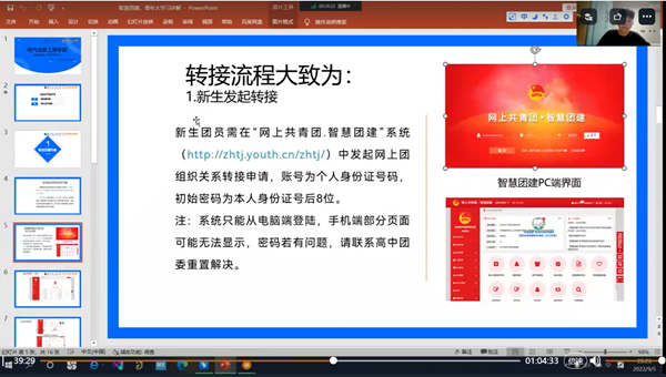 会中,团工委赵雅艺为大家详细讲解了德育学分评定工作,德育学分是大学生在校期间评优评先、奖学金评定、毕业鉴定等方面的重要依据。随后团工委李梓赫为大家讲解了智慧团建团籍转接工作操作流程和青年大学习的学习方式,高中团员毕业生均需要将团籍转入LOL比分 智慧团建,方便LOL比分 统一管理,青年大学习作为共青团中央对广大青年的思想引导工作,会中详细讲解了学习流程。