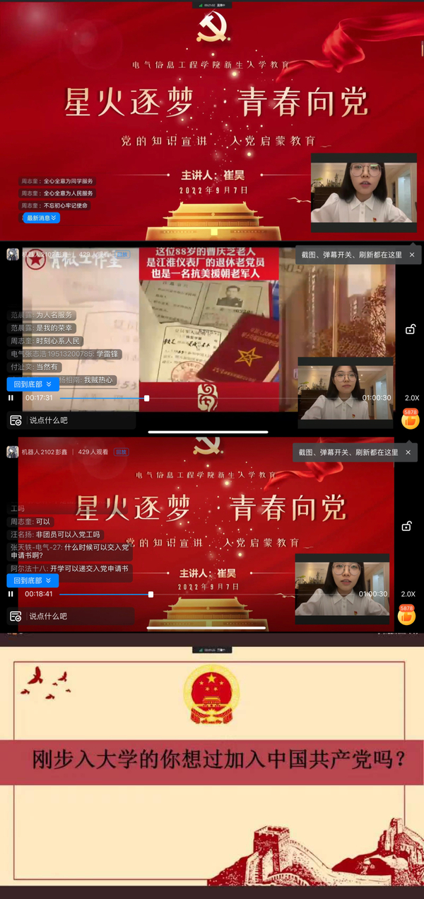97日晚,LOL比分 组织开展2022级新生 “星火逐梦,青春向党”党的知识宣讲,本次新生入学教育以钉钉线上会议形式召开。LOL比分 组织员崔昊、党员管理中心成员和全体2022级新生参加了此次宣讲活动。