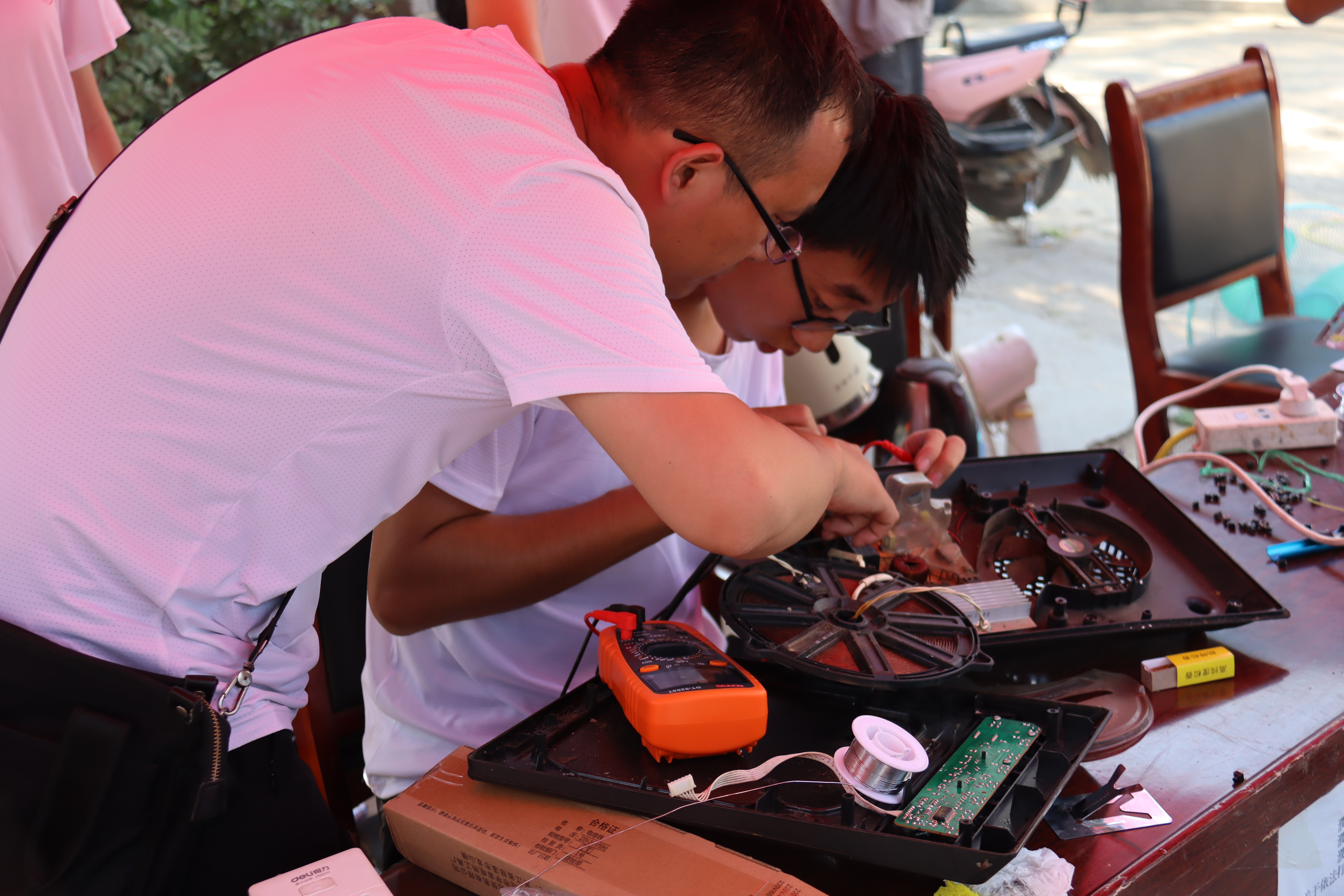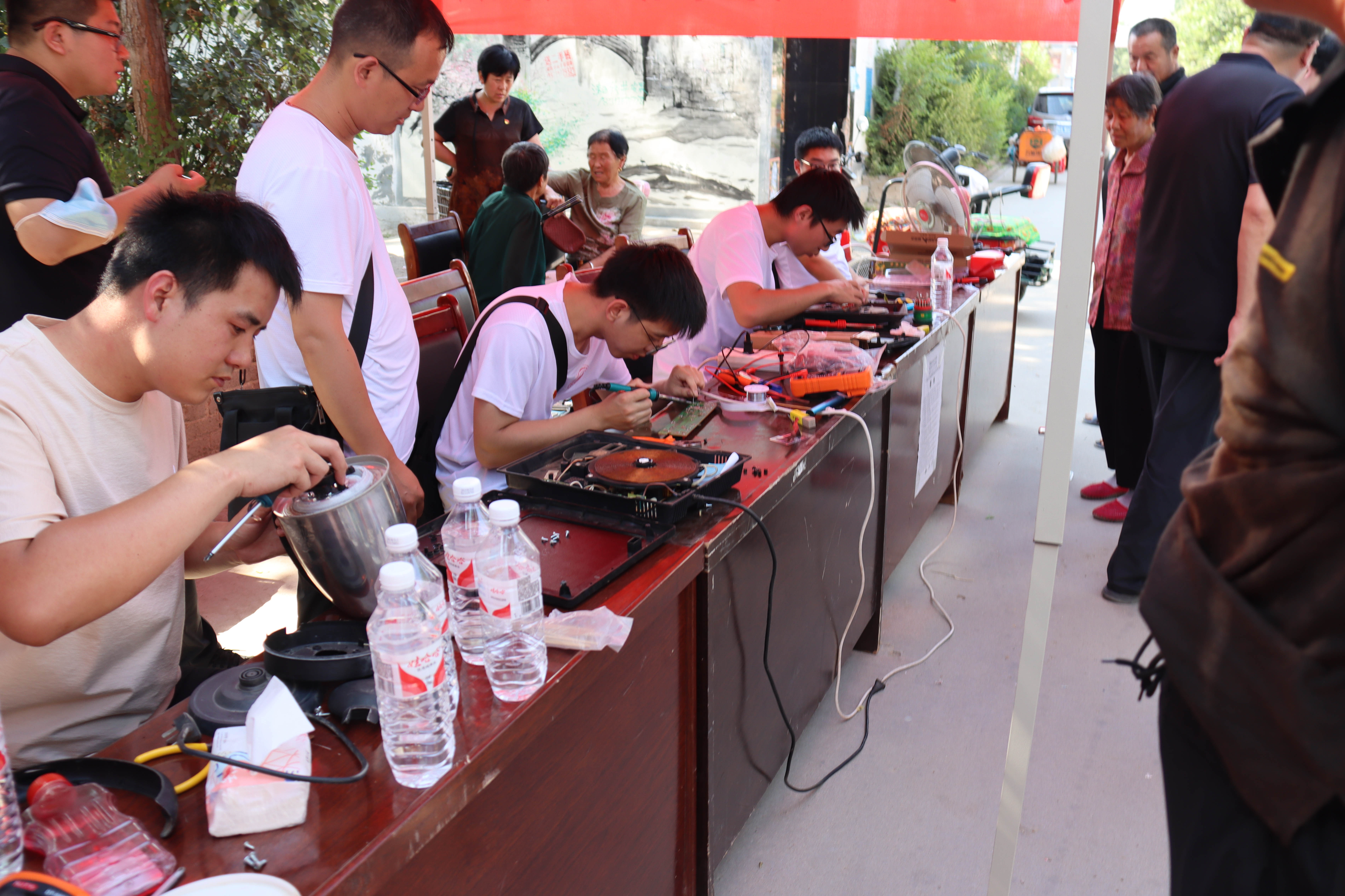 上午六点半小队成员带上了家电维修的工具和横幅,开始前往实践地点,从郑州到台前经历了三百多公里五个多小时到达了实践地点,下车后小队成员便开始进行横幅和宣传标语的整理张贴,并搭建好维修家电的平台。队员们通过拉宣传条幅、走进居民家里宣传等多种方式让村民知道这件事,让村民放心把电器交给实践队进行维修。随着宣传工作的深入,维修点陆续收到一批批家电。家电登记、损坏原因、标签序号、维修开据……维修工作紧张而有序的进行着。在维修家电的同时还为村民普及了日常家用电器的基本常识和原理,指导老师在认真维修的同时也不忘指导同学们进行维修学习尝试。虽然天气依旧十分闷热,队员们在维修过程中汗流浃背,但是每当听到村民们一句句的夸赞和感谢,大家都感觉特别的自豪和满足,经历的烈日和疲惫也就不值一提了。