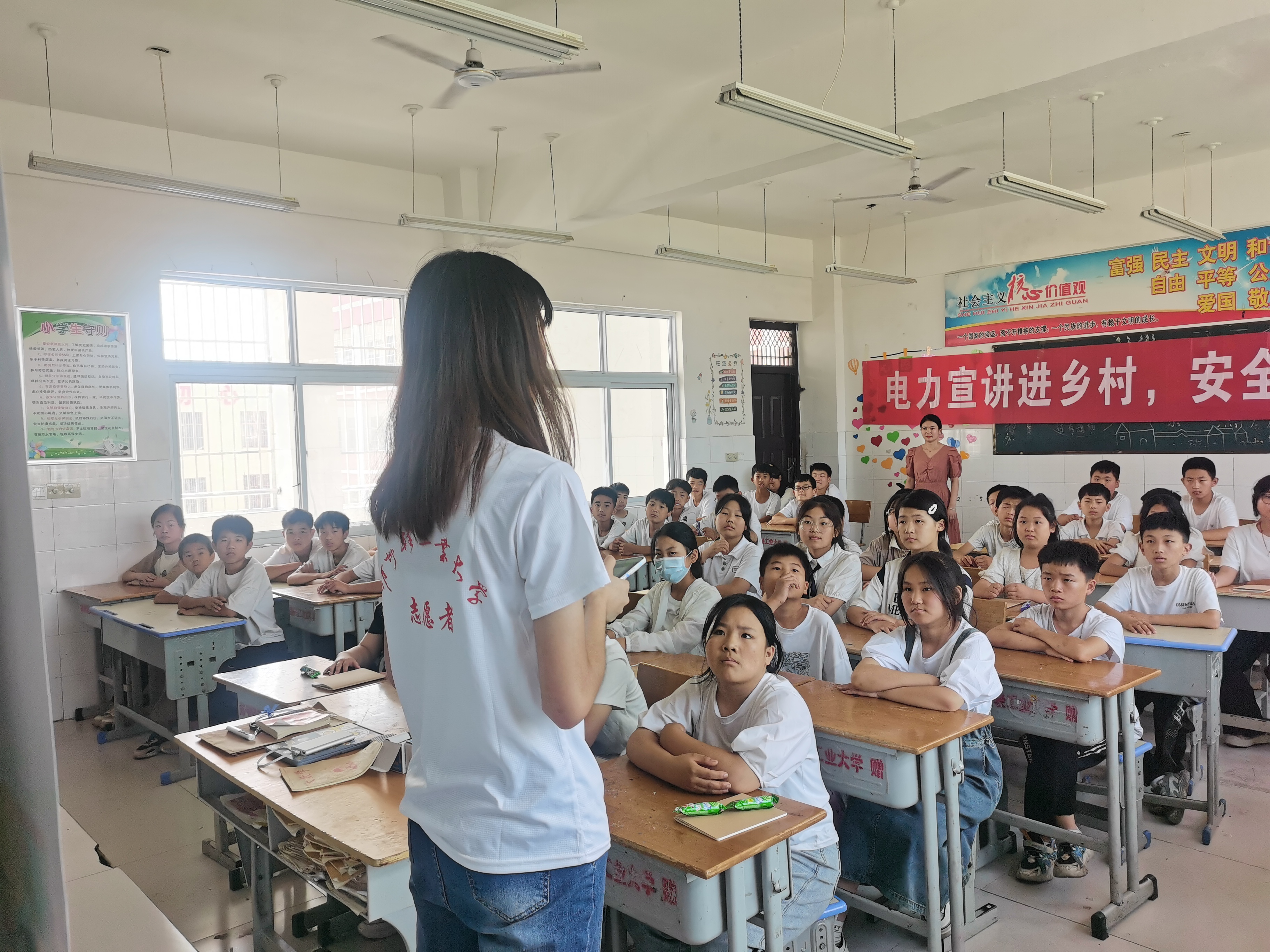 7月1日,郑州轻工业大学“轻小电”用电安全宣讲志愿服务队来到濮阳市台前县清东村,为当地小学的同学们送上了一场精彩的安全用电宣讲。