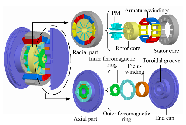 针对永磁电机磁通调节困难,且在基速以上采用弱磁控制时,转矩不可避免降低的问题,论文提出了具有轴-径向磁路的新型磁矩双调混合励磁电机。该电机通过特殊的轴向结构提供轴向交变磁动势,不仅充分利用轴向漏磁提高了电机的输出转矩,并且具有良好的调磁能力。论文推导出了气隙磁通和附加转矩方程,阐述了磁矩双调混合励磁电机的调磁原理与转矩产生机理,明确了影响磁通和附加转矩的关键因素。进一步阐明了励磁电流对磁通和转矩性能的影响机理,确定了励磁电流与不同转矩和磁通的匹配机制。最终实现电机最大磁通调节幅度达19.1%,转矩增加48.1%。