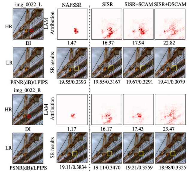 立体图像超分辨率旨在通过有效利用立体图像对的跨视图互补信息重建高分辨率图像。常见方法是使用特征融合模块,该模块允许模型关注并融合来自左右视图的相关特征。然而,局部归因图(LAM)的诊断分析表明,现有方法在利用左右视图互补信息方面仍存在局限性。为解决这一问题,本文提出双立体交叉注意力模块(Double Stereo Cross-Attention Module, DSCAM),其中采用重叠立体交叉注意力(Overlapping Stereo Cross-Attention, OSCA)机制,通过引入重叠窗口操作,使DSCAM能够增强跨视图互补信息的利用,并通过额外的乘法步骤进一步强化组合特征。此外,本文提出一种立体图像退化模型,结合多级退化并确保立体图像对的退化一致性,从而更准确地模拟现实场景中退化过程。大量实验表明,本文方法在现实场景中立体图像超分辨率问题上取得了显著的视觉质量提升。