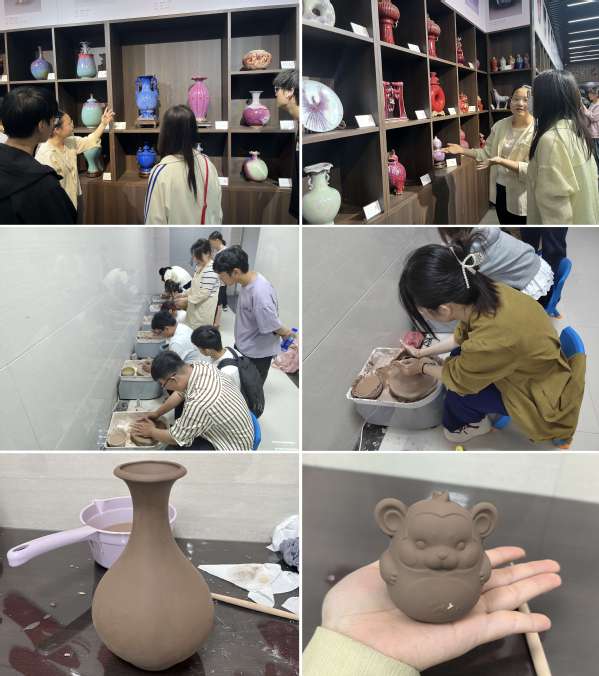 活动中,讲解员通过实物展示的讲解,带领学生领略钧瓷“窑变无双”的独特魅力。从宋代官窑的辉煌历史到现代钧瓷的创新发展,以“钧瓷烧制七十二道工序”为例,诠释“十年磨一器”的工匠精神。学生们近距离观察钧瓷“蚯蚓走泥纹”“星辰釉”等经典纹路,惊叹于“火与土的艺术”中蕴含的东方智慧。接着,学生们在专业教师指导下,从揉泥、拉坯到塑形,亲身体验陶艺制作的完整流程。拉坯机上旋转的陶泥逐渐成型为杯、碗等器物,学生们在“手随泥走”中感受传统技艺的魅力。活动结束后,学生感叹道:“钧瓷的窑变教会我们,人生也需经历淬炼方能成就光彩。”