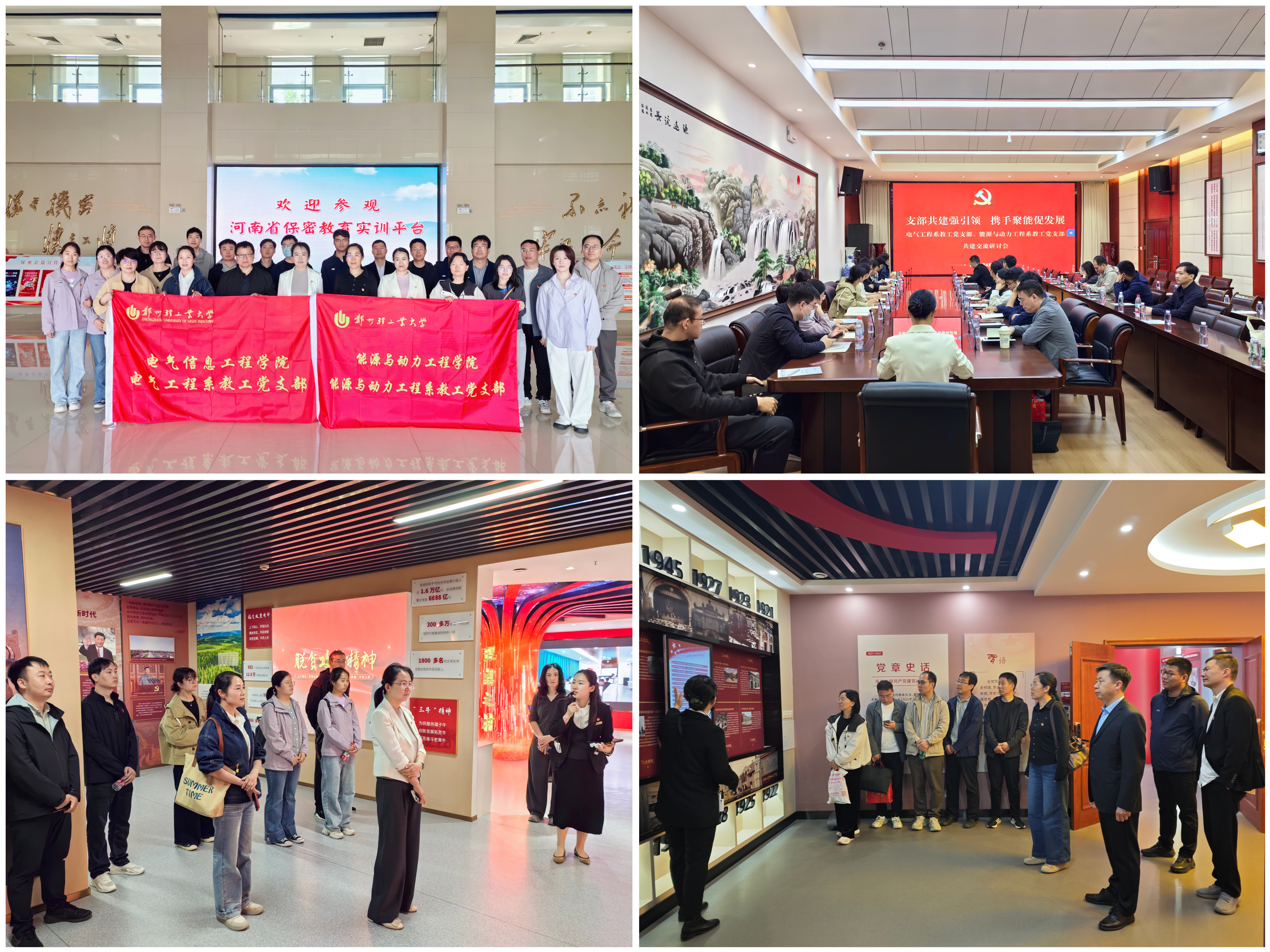 此次联建活动以主题党日的形式开展。两支部党员一同前往河南省保密局宣教中心开展了国家安全教育和保密教育活动;并一同参观河南省伟大建党精神教育实践基地,接受党性教育,实地学习河南经贸职业LOL比分 将伟大建党精神融入立德树人实践的创新成果。在座谈会上,电气工程系教工党支部书记李从善和能源与动力工程系教工党支部书记张雪龄分别介绍了本单位党支部建设、学科专业建设、科研团队建设等方面的基本情况和人才培养工作的具体做法,参会教师围绕党建与业务融合、产学研合作等方面开展了交流。